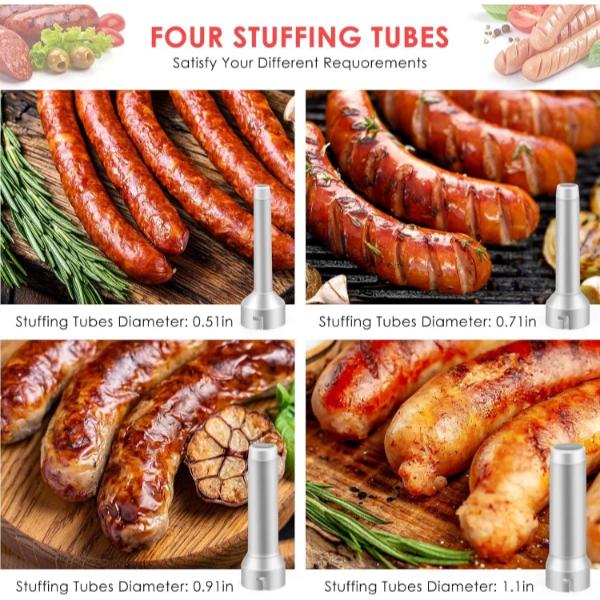 Tento plnič klobás obsahuje štyri PP dýzy s rôznymi priemermi: 1,3 cm, 1,8 cm, 2,3 cm a 2,8 cm.