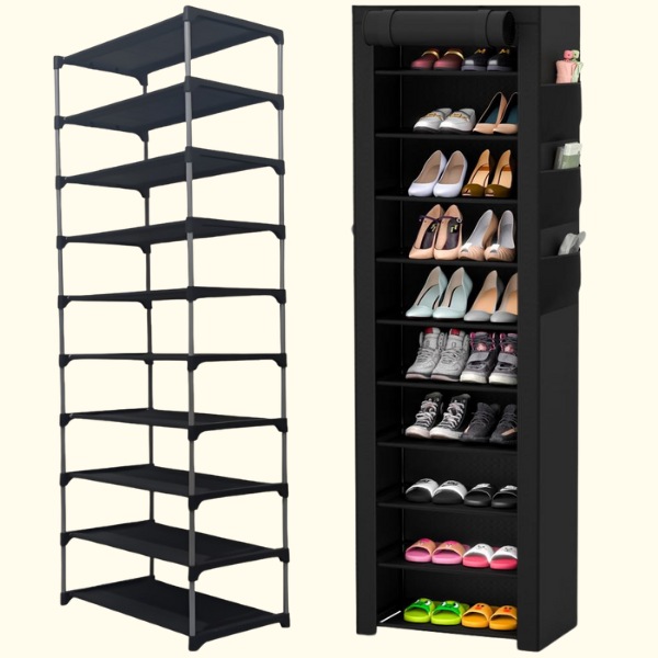 OMARA prenosný a skladací stojan na topánky má 10 nastaviteľných políc. Umožňuje uložiť až 20 párov topánok, udržiava vašu zbierku prehľadnú a ľahko dostupnú.